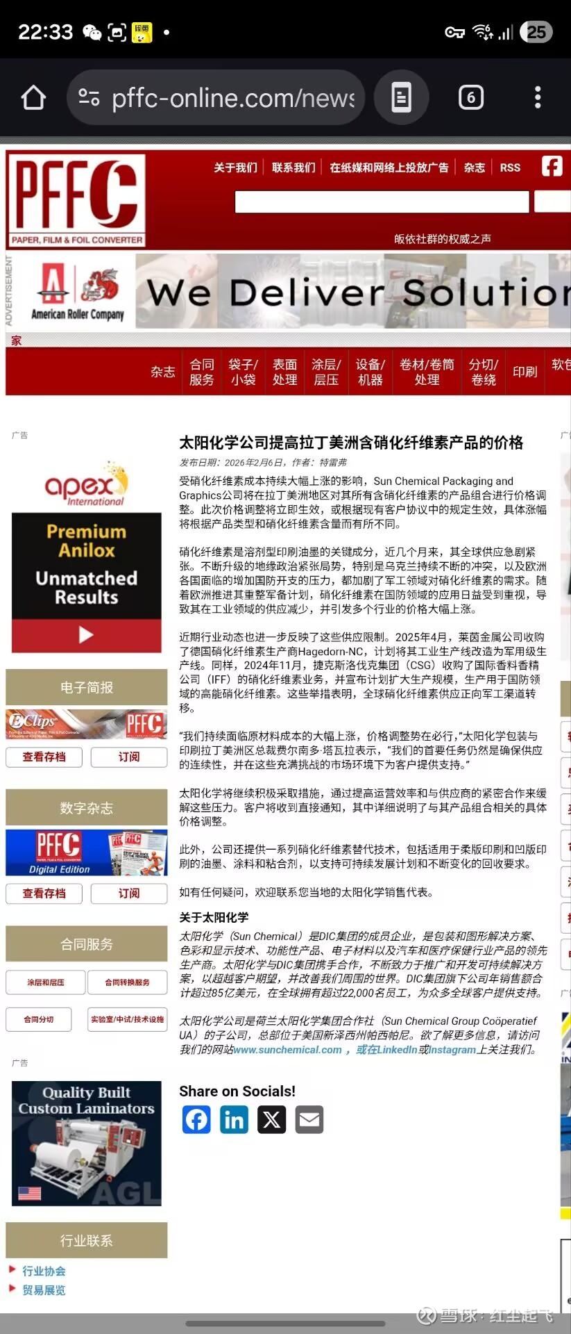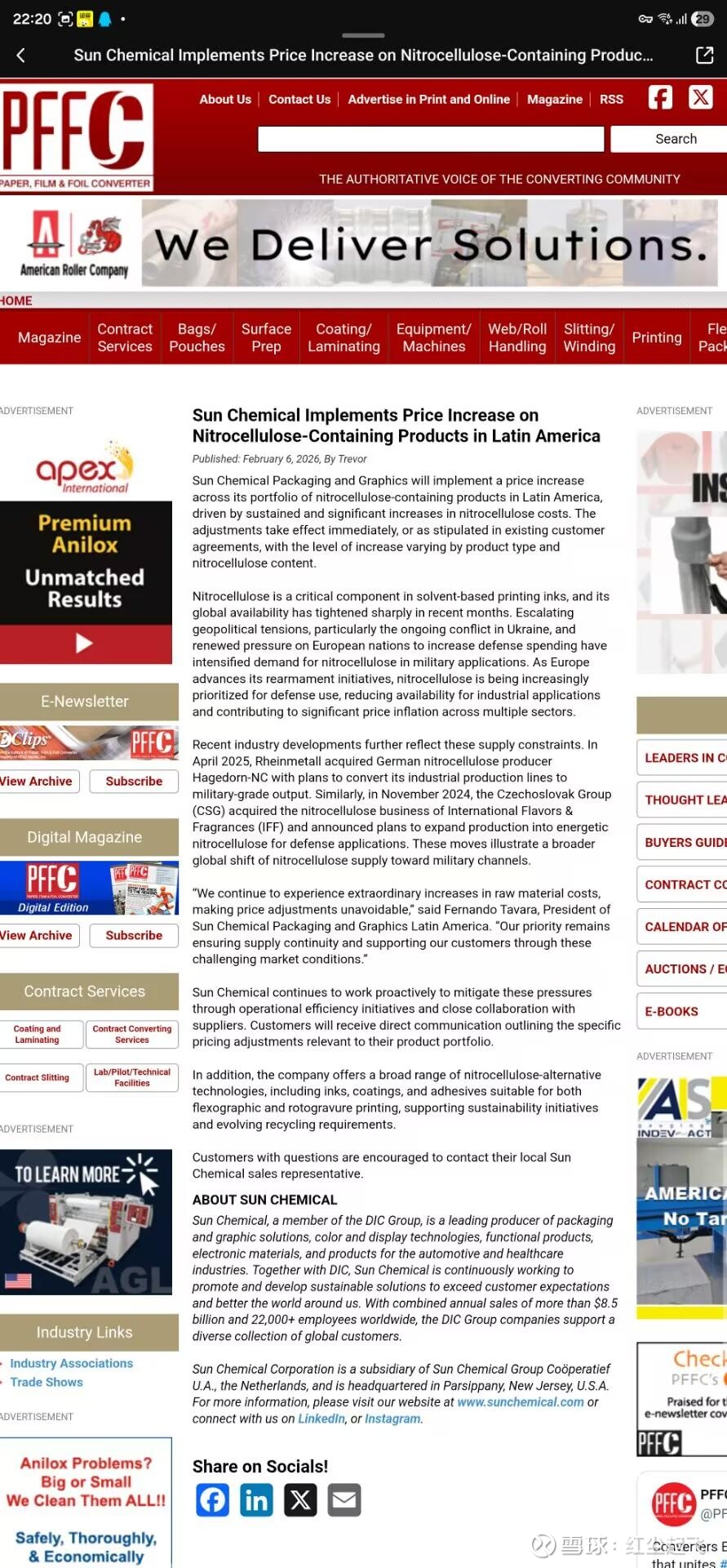 受硝化纤维素(硝化棉)成本持续大幅上涨的影响,全球最大印刷油墨制造商太阳化学