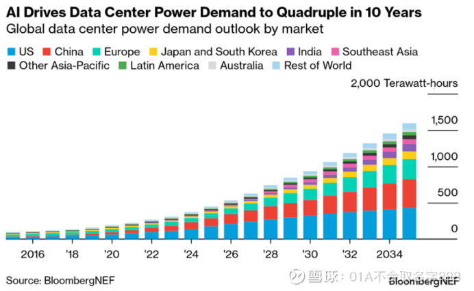 根据BNEF《全球数据中心用电需求展望》报告,2024年全球数据中心电力消费达370TWh。若将数据中心视为一个国家,其用电量已经超过英国等发达国家,成为全球第十大电力消费国。受AI发展驱动,预计未来十年数据中心电力需求将增长三倍至1,600TWh,占总电力需求4.4%。