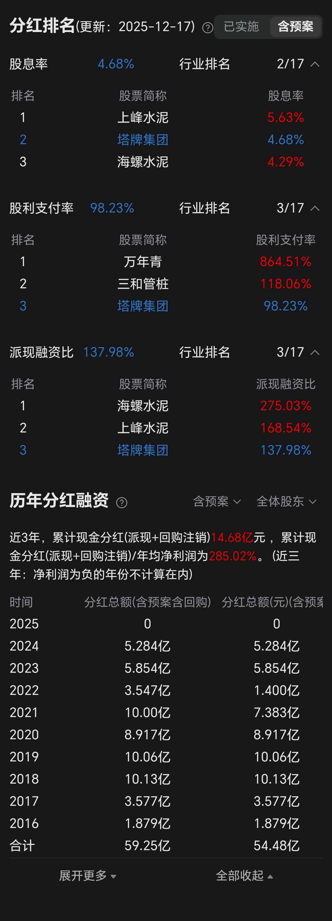 塔牌集团主营业务是华南地区销售水泥,在往后8年的业绩采取非常保守的估计。2015~2024年总利润是101亿,分红61亿,60%的派息率(还行),2025~26保底分红10亿元,后6年分10亿,合计20亿。
