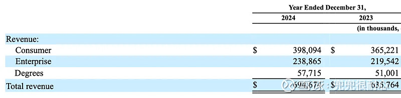 3)Degree:通过与大学合作获得收入,从Online Degree和Master项目中获得学费分成,占收入的剩余部分(贴一张2024年的图,不是最新的,但是也够分析他的主要收入了)