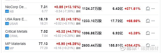 三是:392在矿源落定下,开始走出异动行情,且自身行情独立性强,后边可以观察是否具有代表及引领性。另外,从昨日欧美盘面看,美国几大稀土股整体表现强势,看看以MP为代表的几大稀土股能否再次走出一波行情。