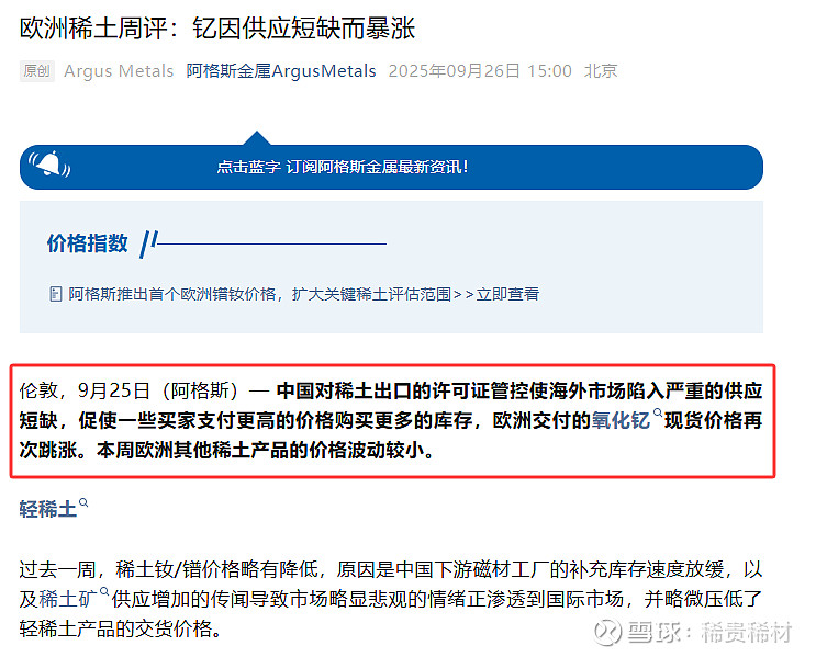 9月25日(阿格斯)— 中国对稀土出口的许可证管控使海外市场陷入严重的供应短缺,促使一些买家支付更高的价格购买更多的库存,欧洲交付的氧化钇现货价格再次跳涨。本周欧洲其他稀土产品的价格波动较小。