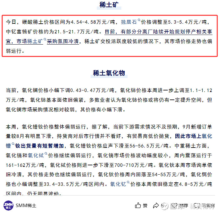 一是:SMM消息:【SMM稀土周评】部分分离厂陆续开始规划停产