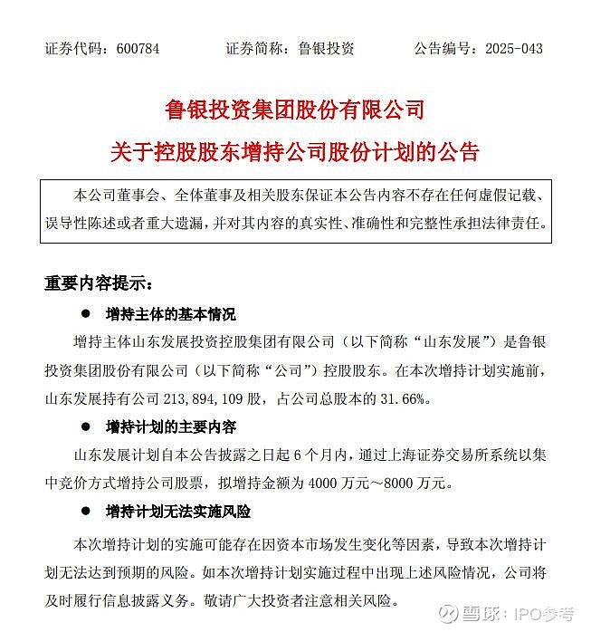 @今日话题 【鲁银投资:控股股东山东发展拟增持4000万元~8000万元公司股份】鲁银投资10月13日公告,公司控股股东山东发展投资控股集团有限公司计划自公告披露之日起6个月内,通过上海证券交易所系统以集中竞价方式增持公司股份,拟增持金额为4000万元~8000万元,增持比例不超过公司总股本2%。增持资金来源为自有资金及股票增持专项贷款。山东发展承诺在增持实施期限内完成增持计划,且增持比例合计不超过公司总股本的2%,在增持计划实施期间及法定期限内不减持所持有的公司股份。