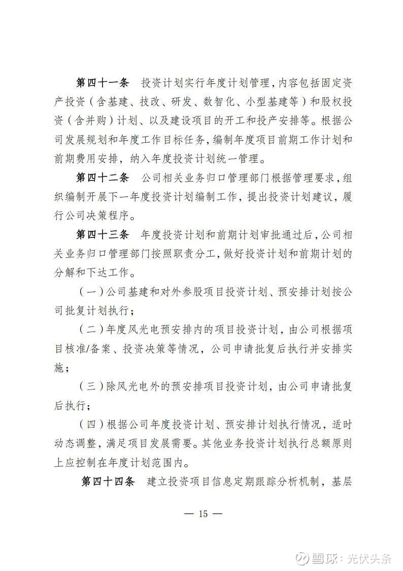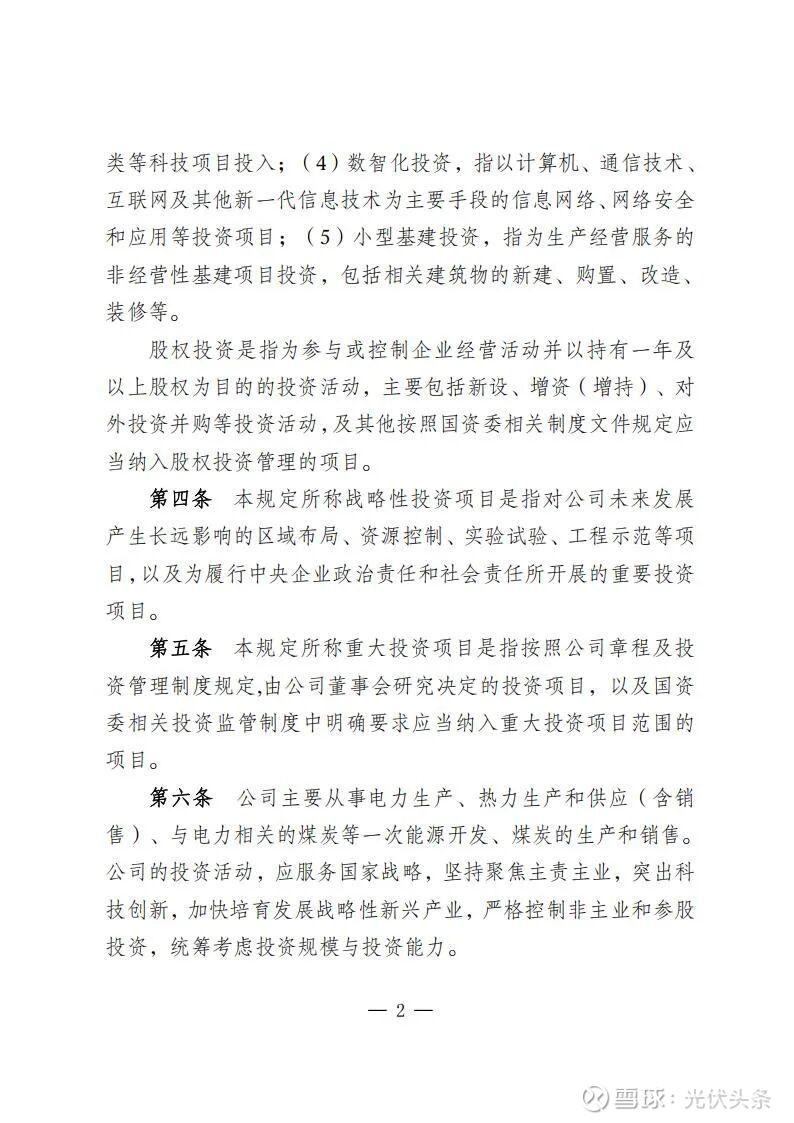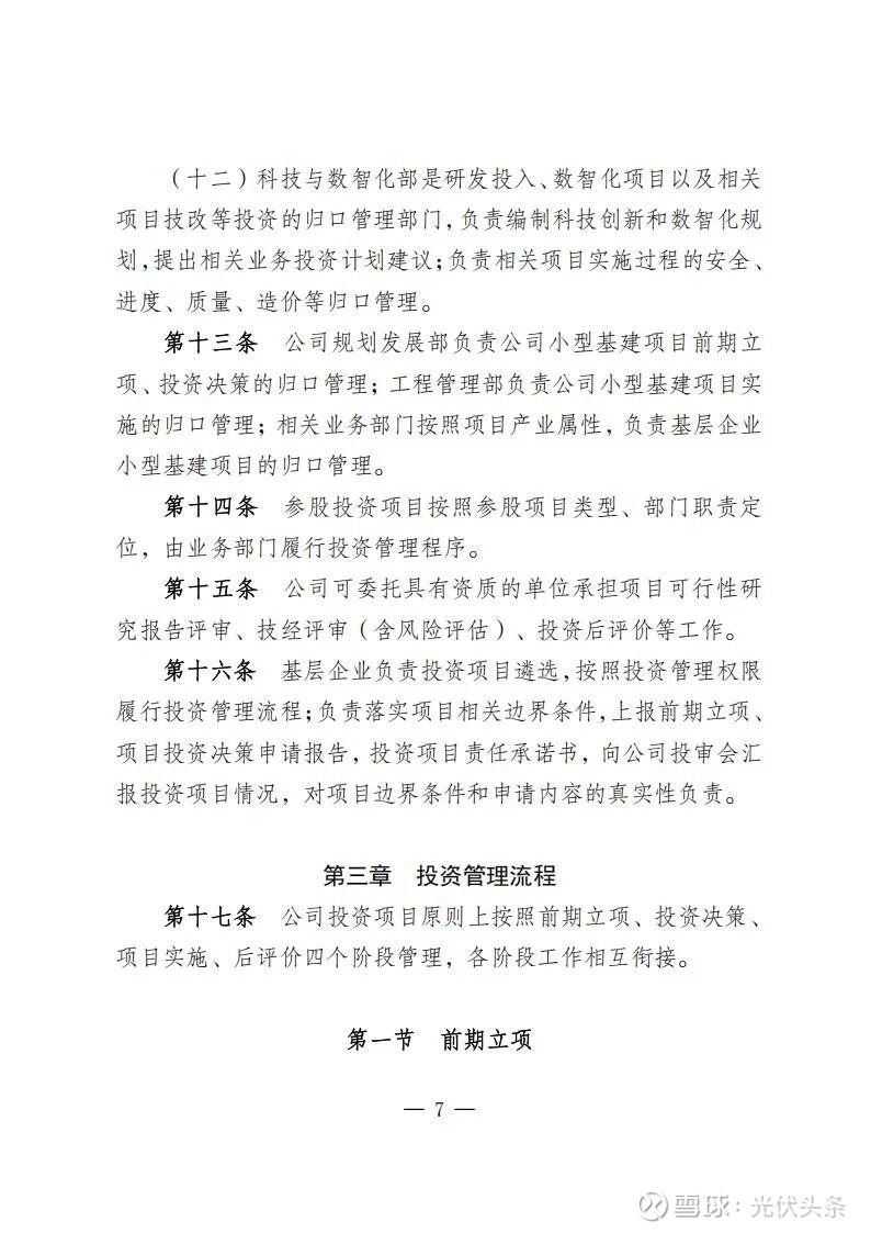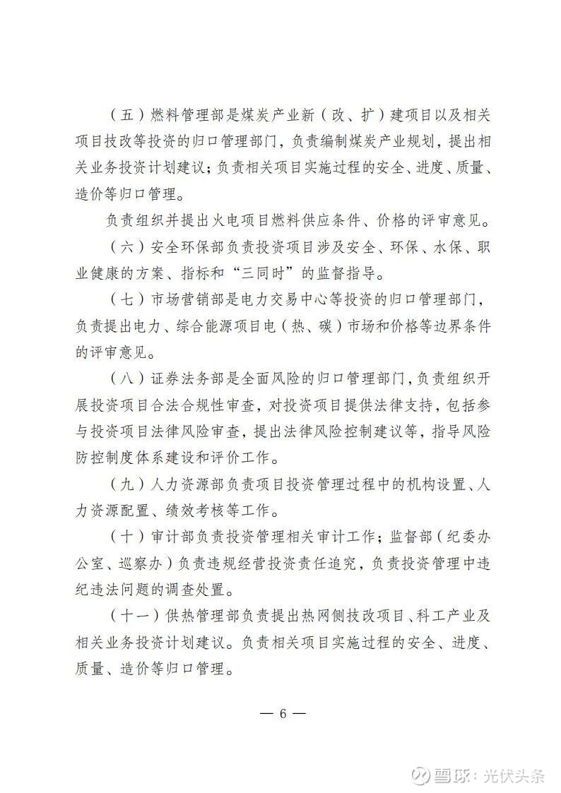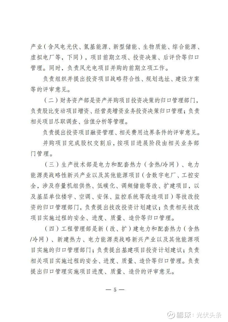 规定指出,规划发展部是公司投资管理的归口部门,负责组织研究制订投资管理有关规定;负责组织编制发展规划、投资计划和前期工作计划和后评价计划;负责境内新(改、扩)建电力和配套热力(含热/冷网)、新建热力项目、电力能源类战略性新兴产业(含风电光伏、氢基能源、新型储能、生物质能、综合能源、虚拟电厂等),项目前期立项、投资决策、后评价等归口管理。同时,负责风光电项目并购的前期立项工作。