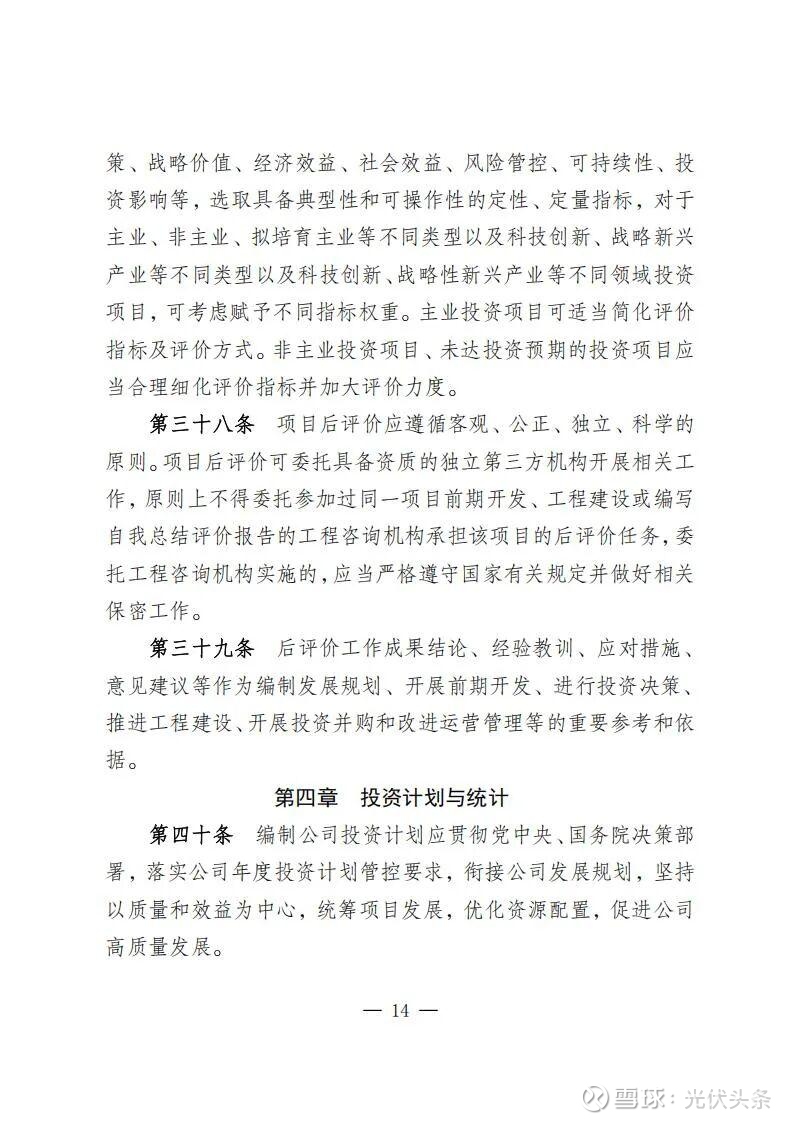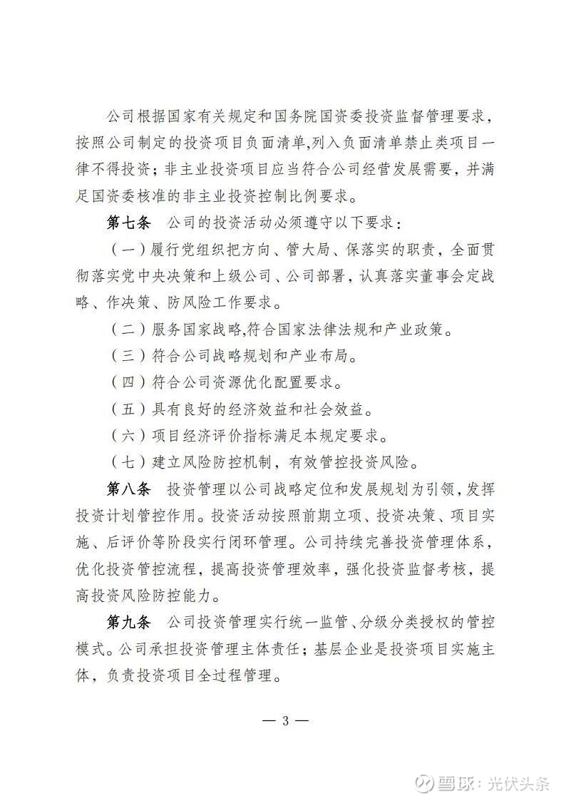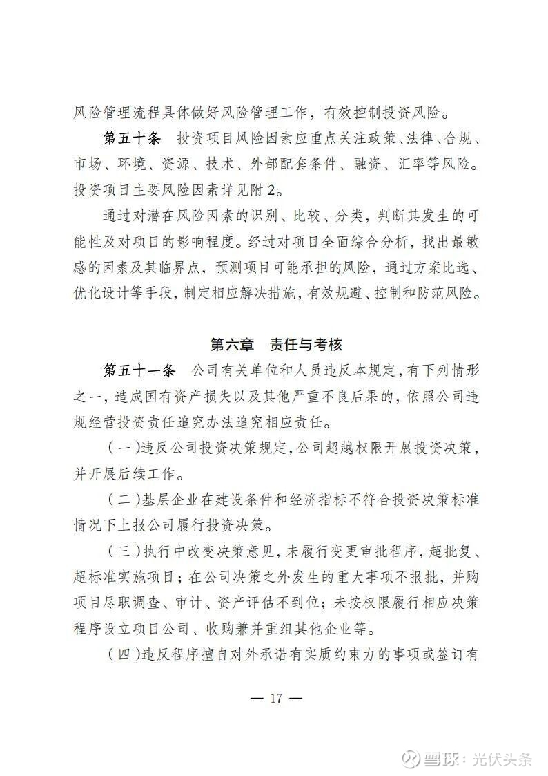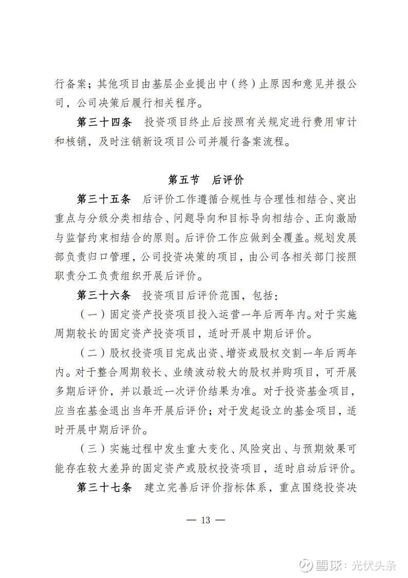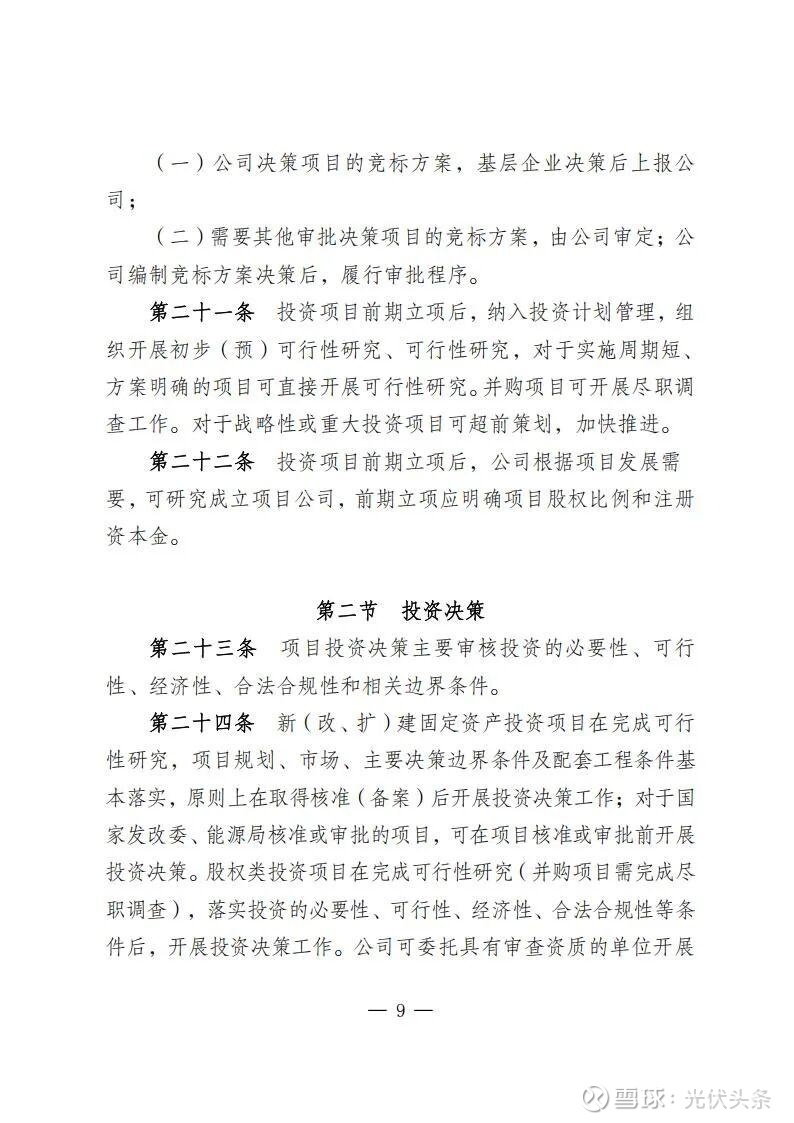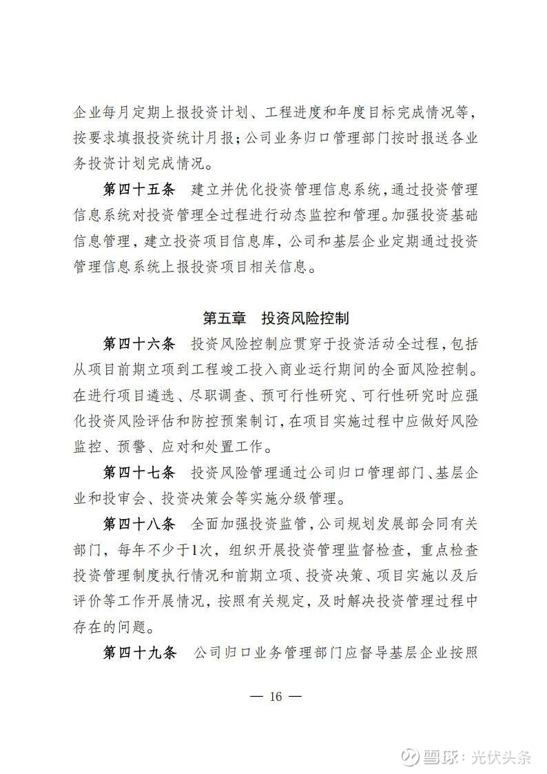 规定指出,规划发展部是公司投资管理的归口部门,负责组织研究制订投资管理有关规定;负责组织编制发展规划、投资计划和前期工作计划和后评价计划;负责境内新(改、扩)建电力和配套热力(含热/冷网)、新建热力项目、电力能源类战略性新兴产业(含风电光伏、氢基能源、新型储能、生物质能、综合能源、虚拟电厂等),项目前期立项、投资决策、后评价等归口管理。同时,负责风光电项目并购的前期立项工作。