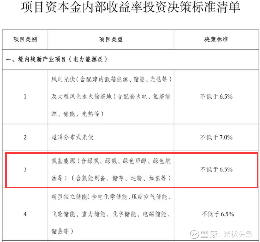 在具体的收益率要求方面,氢基能源(含绿氢、绿氨、绿色甲醇、绿色航油等)(含氢能制备、储存、运输、加氢等)项目,资本金内部收益率投资决策标准不低于6.5%。