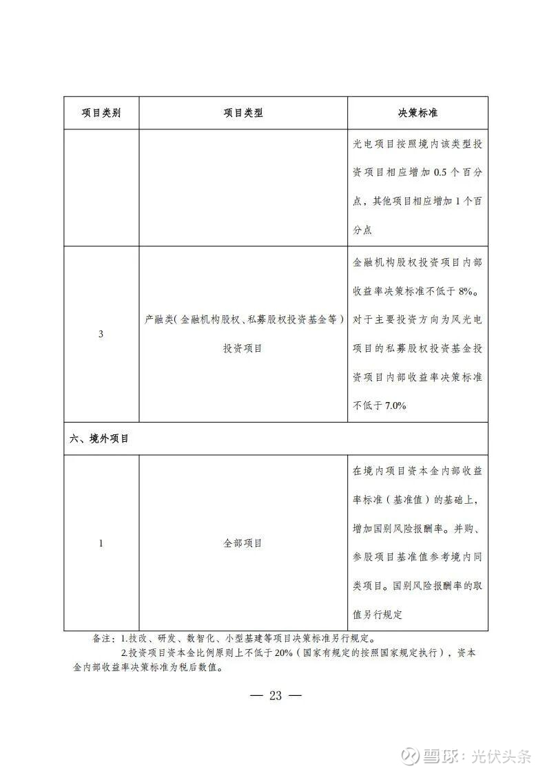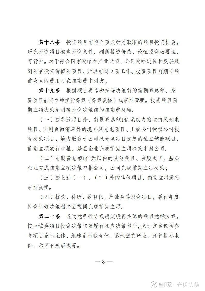 风电光伏项目总投资20亿元以内自建项目、10亿元以内并购项目;其他电力能源类战新产业项目总投资1亿元以内项目;煤电、气电、供热项目总投资5亿元以内项目;实行分级分类决策机制。