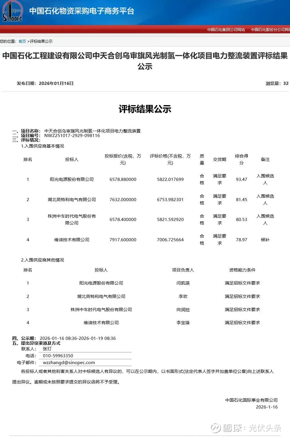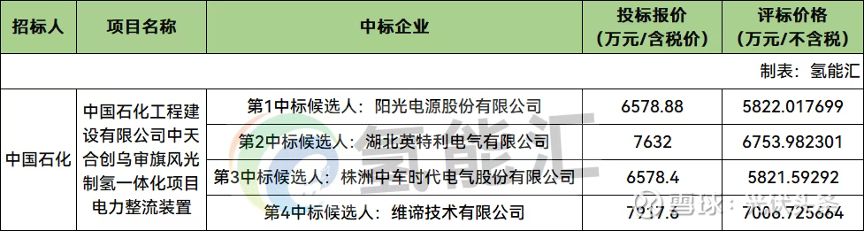 氢能汇获悉,1月16日,中国石化工程建设有限公司中天合创乌审旗风光制氢一体化项目电力整流装置评标结果公示。