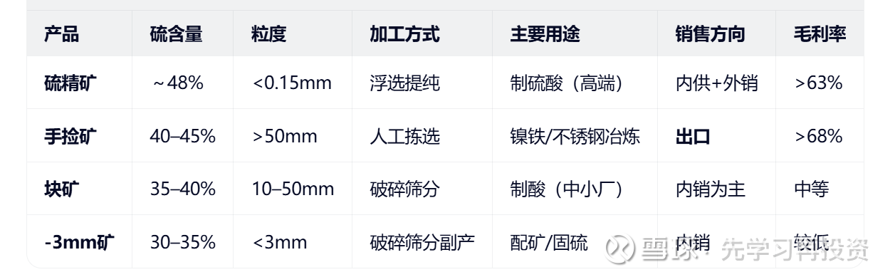 硫铁矿是目前粤桂的核心之中的核心,公司根据矿石的粒度、加工方式、硫含量及下游用途,将产品细分为硫精矿、手捡矿、-3mm矿、块矿四大类。这样分类的原因是:硫铁矿从露天矿山开采出来后,原矿本身包含:大块高品位矿(FeS₂富集区,肉眼可见黄铁矿晶体)、中等碎块、细粉与泥质夹杂部分。若统一破碎浮选会增加能耗(把高品位大块也磨成粉不经济)同时降低整体回收率(细泥干扰浮选效果)。