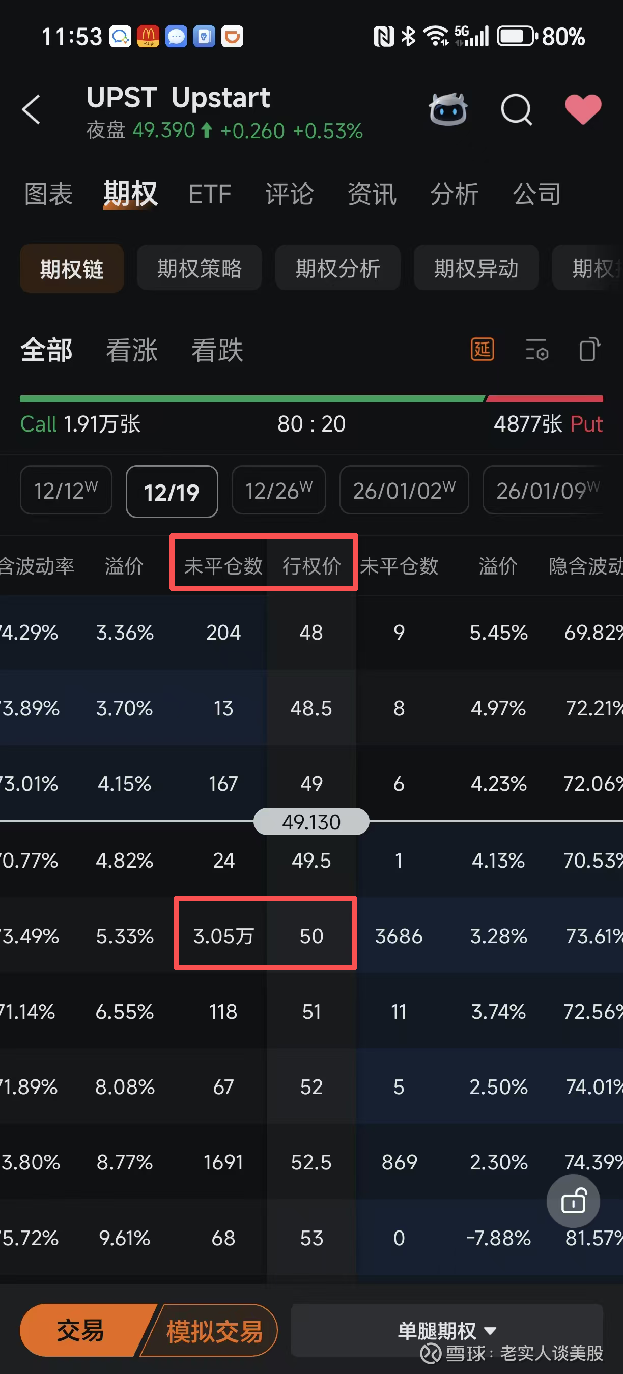 UPST在关键行权价积聚大量看涨持仓。12月19日(一周后)50美元行权价的看涨期权未平仓合约高达 3.05万张,远超其他行权价,且当前股价(49.39)已接近该行权价。若股价突破50美元,大量看涨期权将进入实值状态,做市商为对冲delta风险,需在市场中买入股票,形成“正反馈”推动价格上涨。另外,50美元行权价的看涨期权隐含波动率约为 73.61%,整体波动率处于较高水平,反映出期权市场对价格大幅波动的预期,也为gamma squeeze提供了波动性环境。