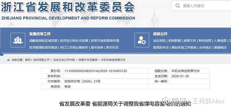 文件指出,浙江省合规在运煤电机组、跨省跨区送浙煤电机组容量电价从2026年起调整为165元/千瓦·年(含税)。