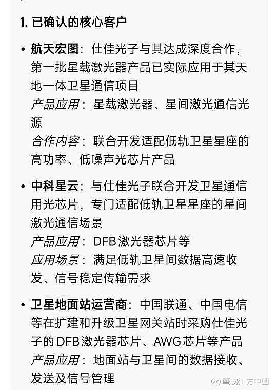 $仕佳光子(SH688313)$ 别老盯着仕佳光芯片的布局,是时候看看仕佳商业航天的潜力啦!仕佳光子供应的光芯片在商业航天领域的应用案例集中于低轨卫星星座星间激光通信及天地一体卫星通信领域,核心合作对象为航天宏图、中科星云等企业,具体如下: