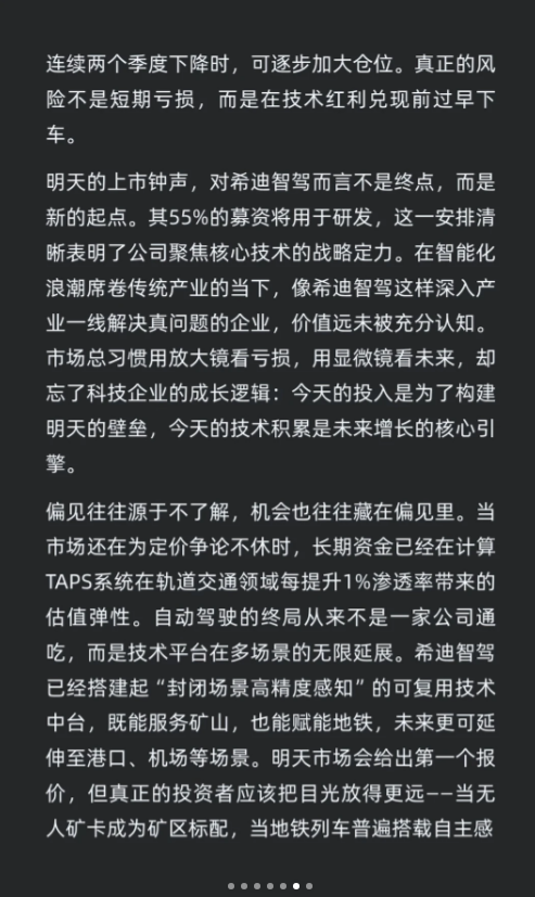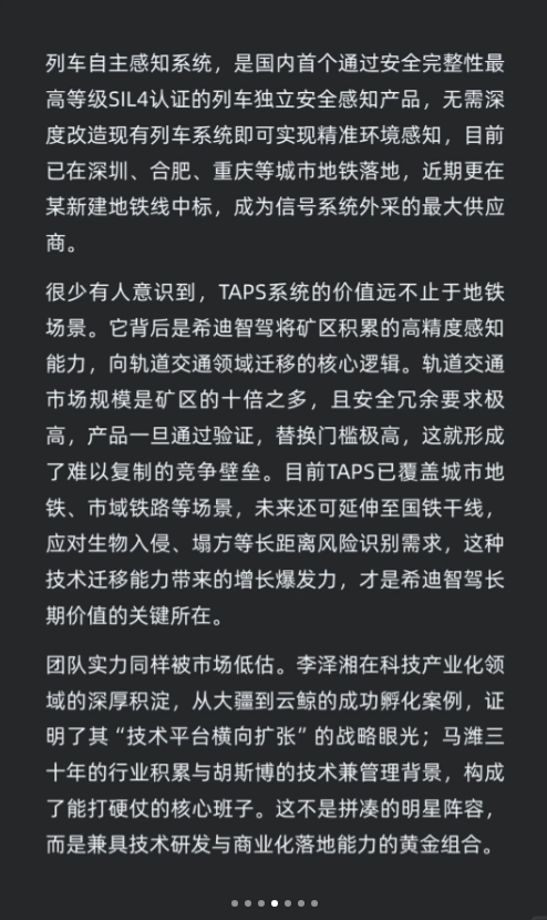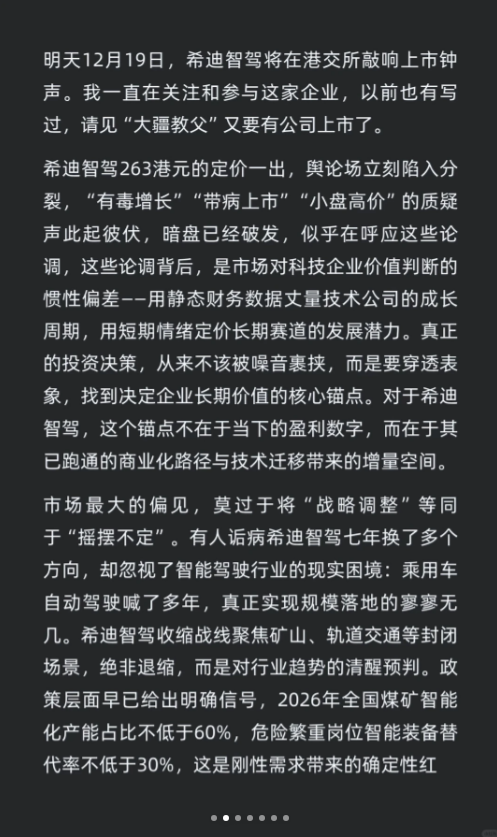 希迪智驾将于12月19日在港交所上市,定价263港元。公司聚焦矿山、轨道交通等场景,已实现商业化落地,TAPS系统在地铁领域表现突出。未来增长依赖技术迁移和第二曲线发展,市场低估其价值。