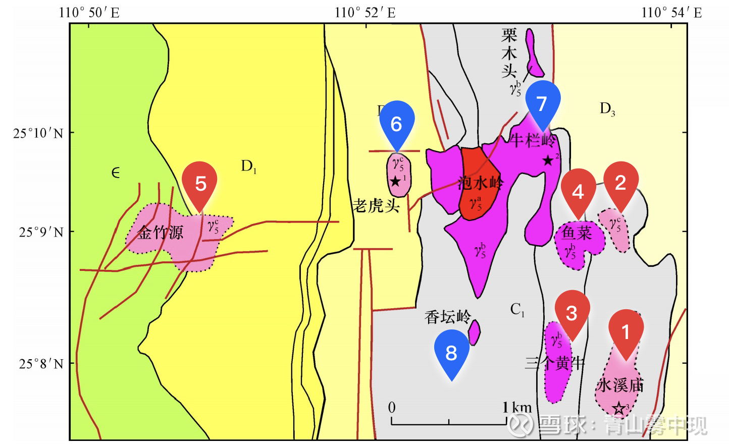 先看下栗木各大矿区分布地图,红色水滴还有矿待开采的,蓝色水滴是开采完关闭的。各矿的备注数字,是本人自定义标注的,为了方便查看理解;