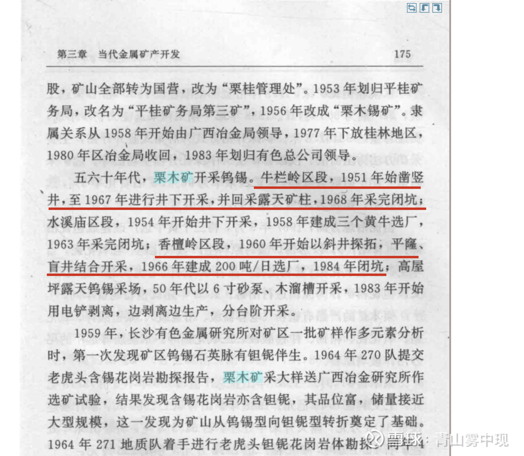 牛栏岭:钨锡石英脉型矿,小型矿区,1951 年开始凿井,1968 年已开采完毕