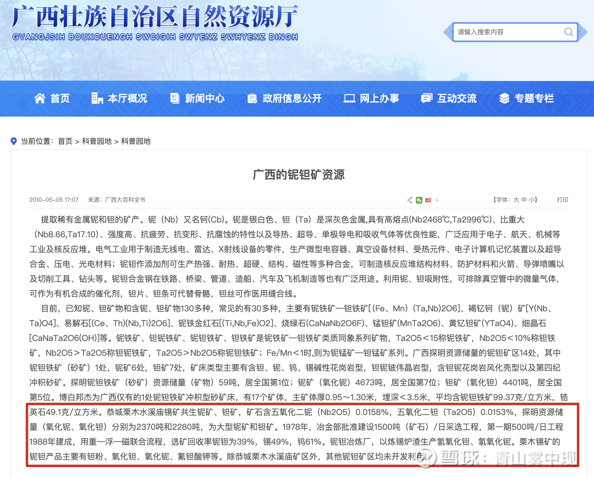 广西自然资源厅公布数据:恭城栗木水溪庙锡矿共生铌矿、钽矿,矿石含五氧化二铌(Nb2O5)0.0158%,五氧化二钽(Ta2O5)0.0153%,探明资源储量(氧化铌、氧化钽)分别为2370吨和2280吨,为大型铌矿和钽矿。