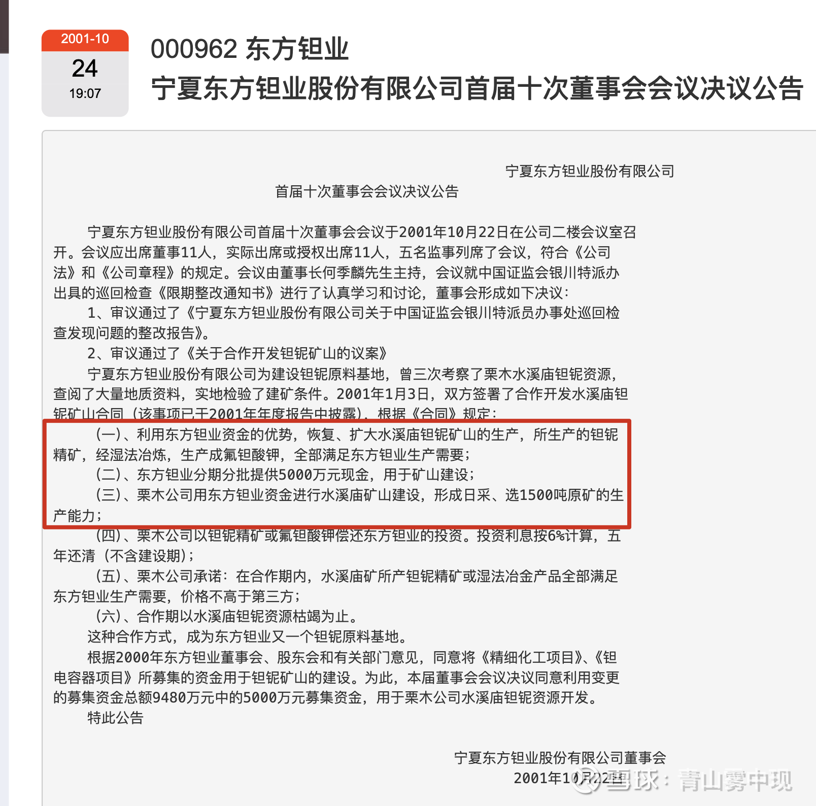 理由2:2001-10-24公告后,时隔几个月栗木矿就第一次申请破产了,这种情况下东方钽业会停止投资;