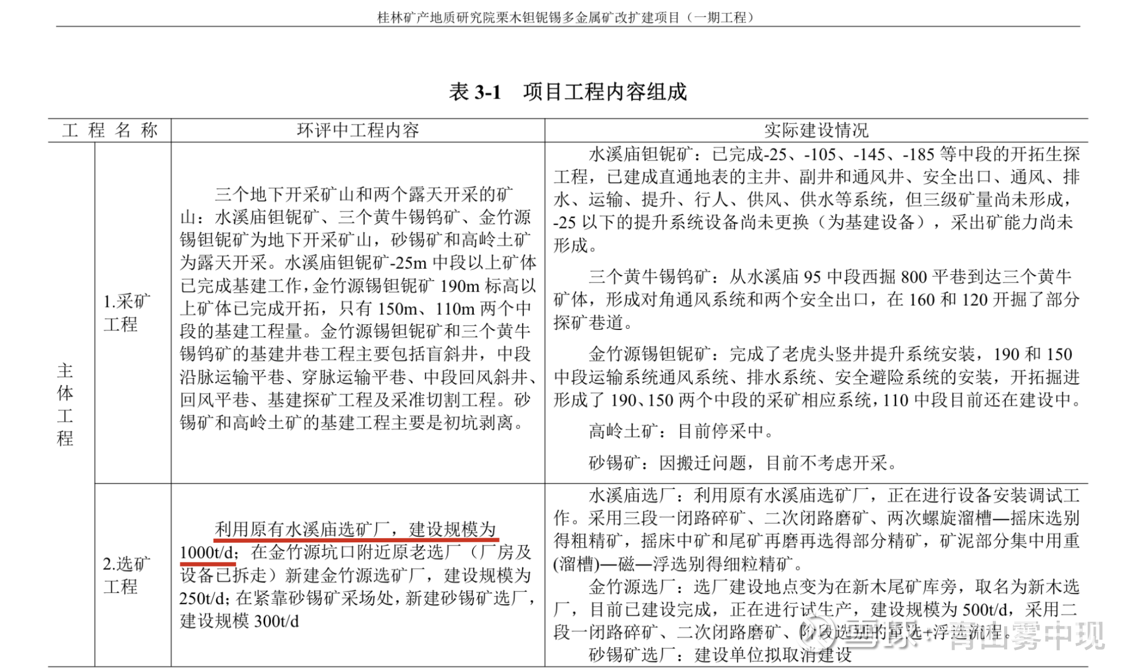 理由3:桂环监验字〔2016〕18 号 - 《桂林矿产地质研究院栗木钽铌锡多金属矿改扩建项目(一期工程)竣工环境保护验收调查报告》中,明确有说明,水溪庙选矿厂的建设规模是1000吨/日;