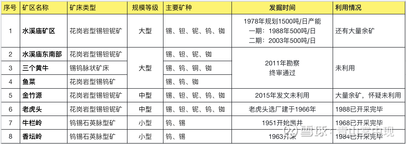 水溪庙矿区(1号):开采部分,花岗岩型锡钽铌矿,大型矿区,一期1988 年建成 500 吨 / 日产能,二期 2003 年增加 500 吨 / 日,还有大部分余矿(价值可观);