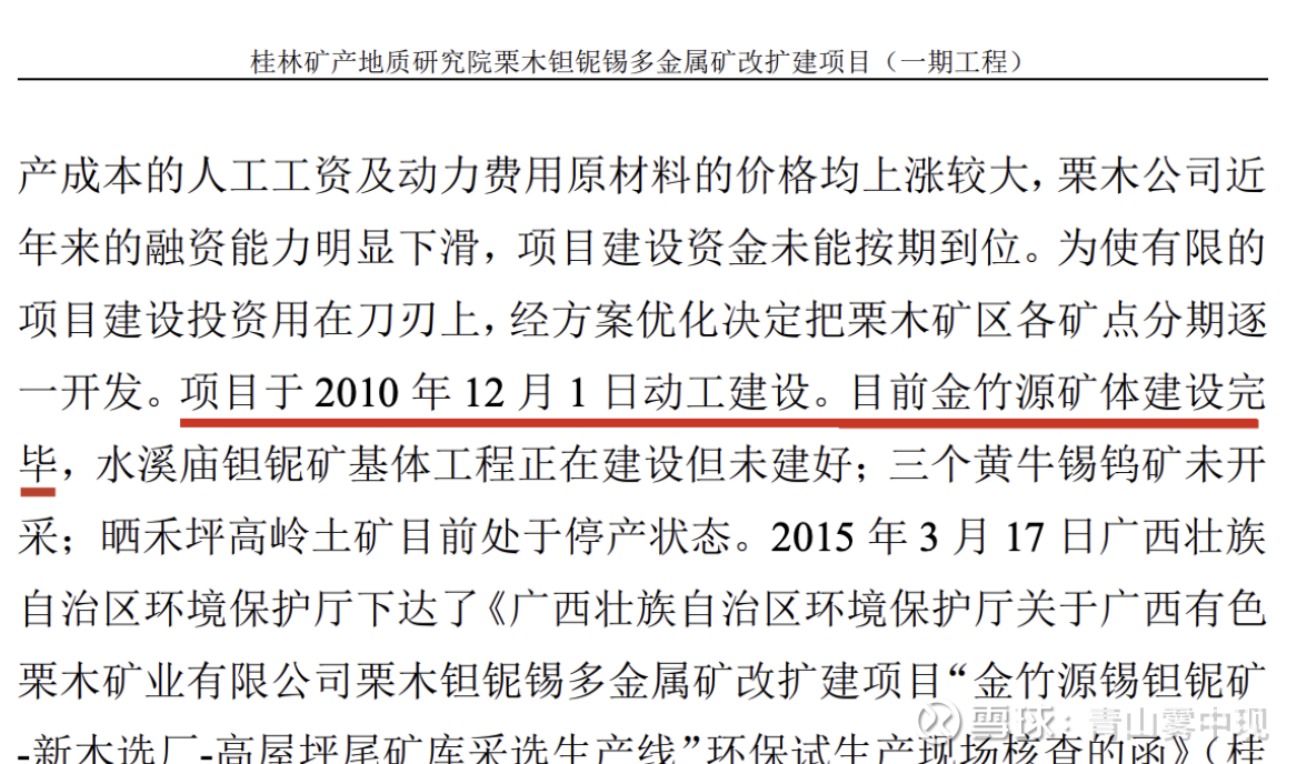 第一次破产时间:2002 年 12 月,因原有矿体资源枯竭、地下开采成本高、产品市场低迷等原因,按国家政策关闭破产。2004 年,广西有色金属集团(广西国企,代表国家层面资源整合力量)成立广西有色栗木矿业有限公司,正式接管栗木矿资产与运营,标志着国家对该矿区的战略重组启动。(时间线上可以看出,03年其实是没动工的)