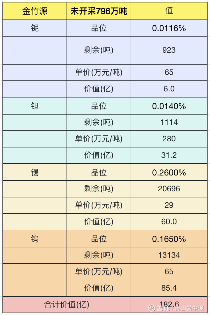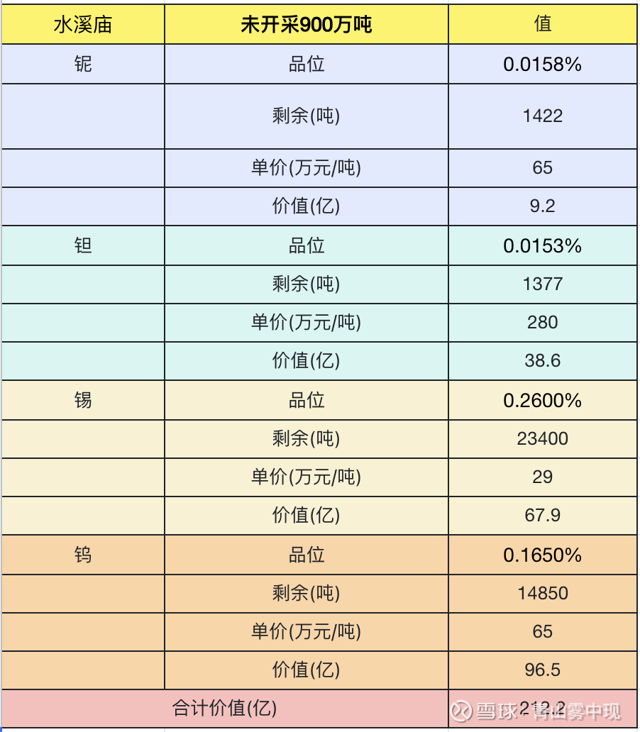 铌:品位 0.0158%,剩余 1422 吨,单价 65 万元 / 吨,价值 9.2 亿;