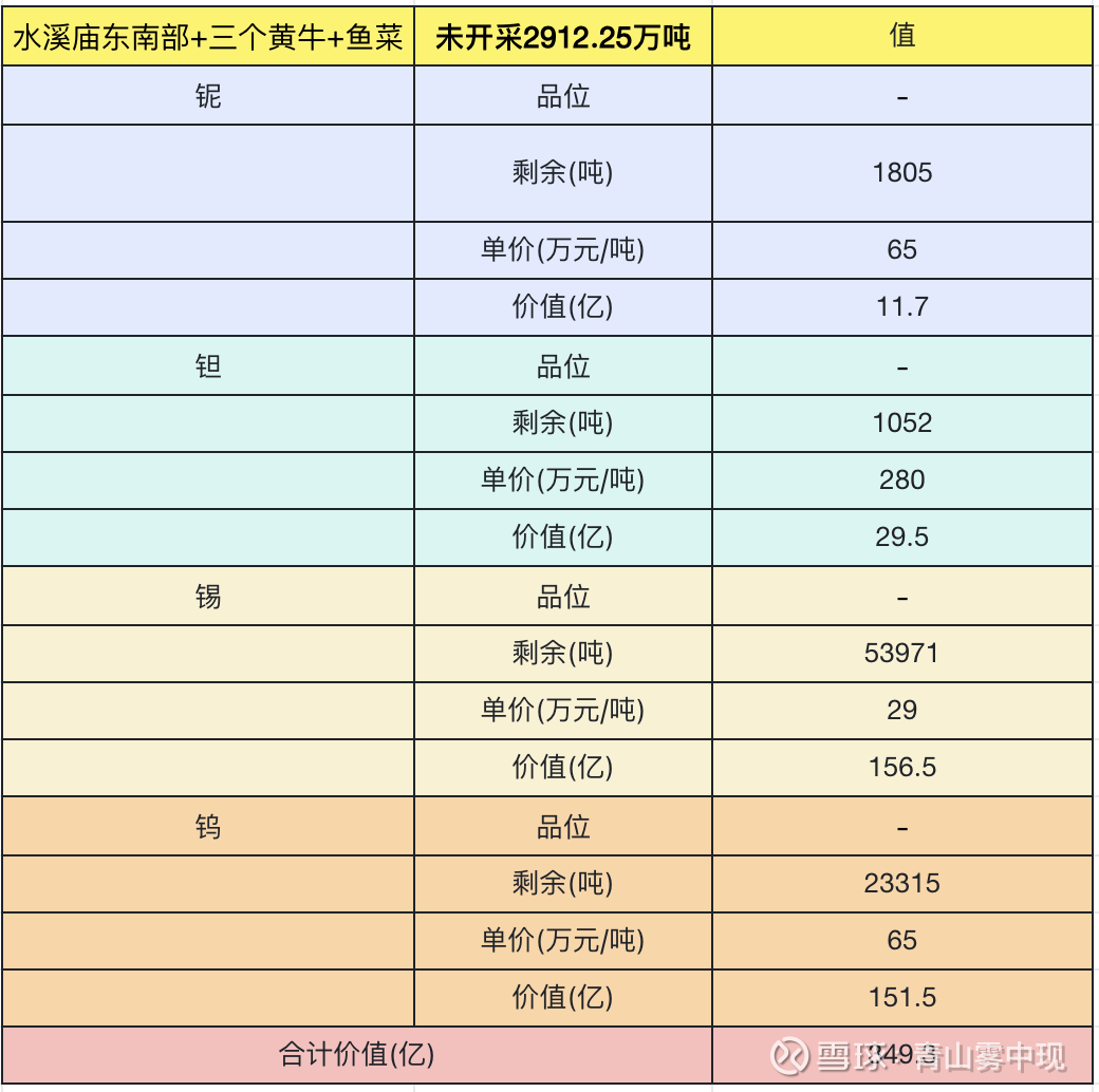 水溪庙东南部+三个黄牛+鱼菜2912.25万吨矿价值合计 349.3 亿