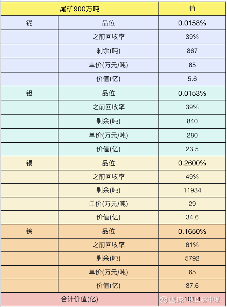 铌:品位 0.0158%,回收率 39%,剩余 867 吨,单价 65 万元 / 吨,价值 5.6 亿;