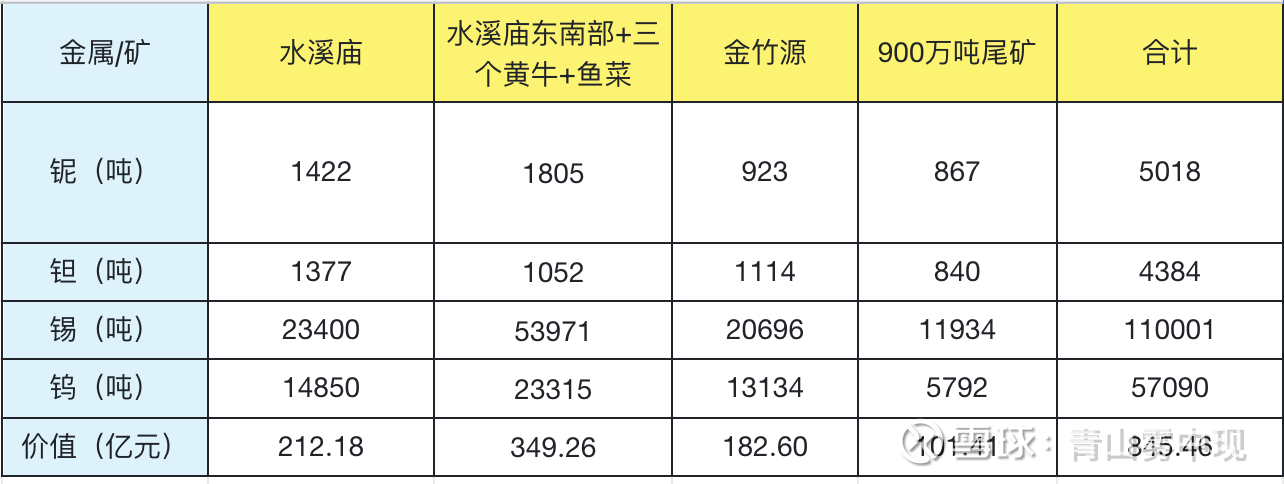 价值合计:水溪庙 212.18 亿、水溪庙东南部 + 三个黄牛 + 鱼菜 349.26 亿、金竹源 182.60 亿、900 万吨尾矿 101.41 亿,总价值 845.46 亿。
