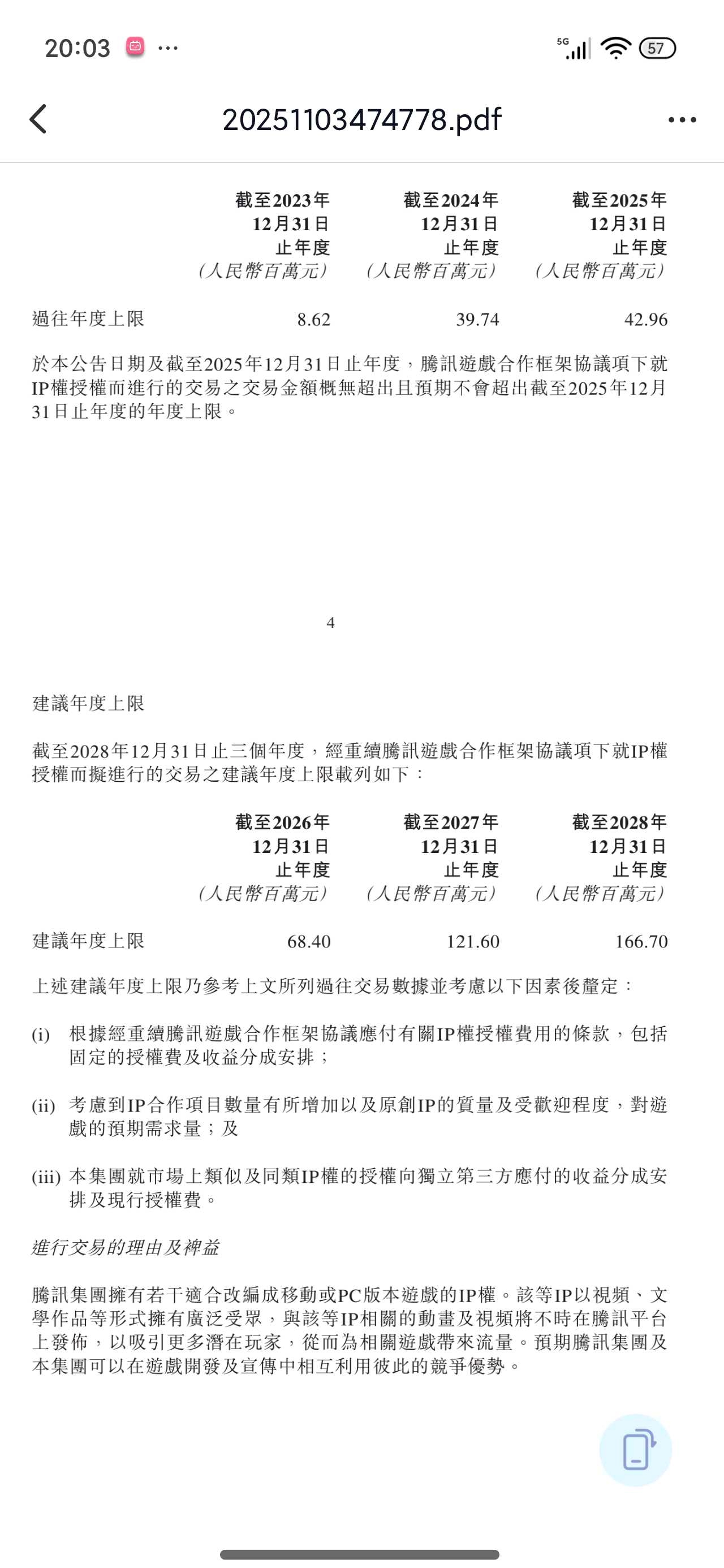 $祖龙娱乐(09990)$ 与占股17.19%的重要股东腾讯集团,16.55%的完美世界,分别续签各项协议至2028年12月31日。其中与腾讯大幅提升IP授权交易上限从0.08亿到1.6亿每年,以获得腾讯集团拥有的若干适合改编成移动或pc版本游戏的IP权。预期腾讯集团及本集团可以在游戏开发及宣传中相互利用彼此的竞争优势。查看图片