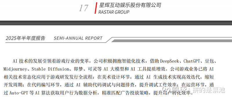 $星辉娱乐(SZ300043)$ 公司积极拥抱智能化技术,借助 DeepSeek、ChatGPT、豆包、 Midjourney、Stable Diffusion、即梦、可灵等 AI 大模型和 AI 工具提质增效。