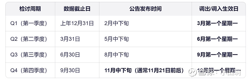 恒生指数公司每年进行 四次定期检讨,对应四个生效时间点: