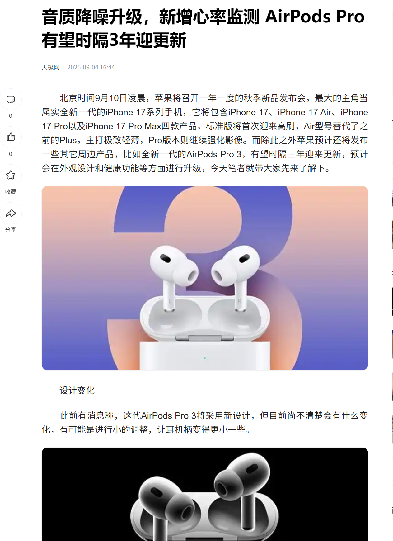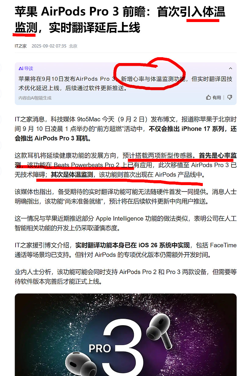 9月10日凌晨1点,苹果将在“前方超燃”发布会上推出AirPods Pro 3。这款新品最大的亮点是在健康监测领域的重大突破——首次加入体温监测 心率监测 功能。