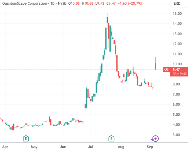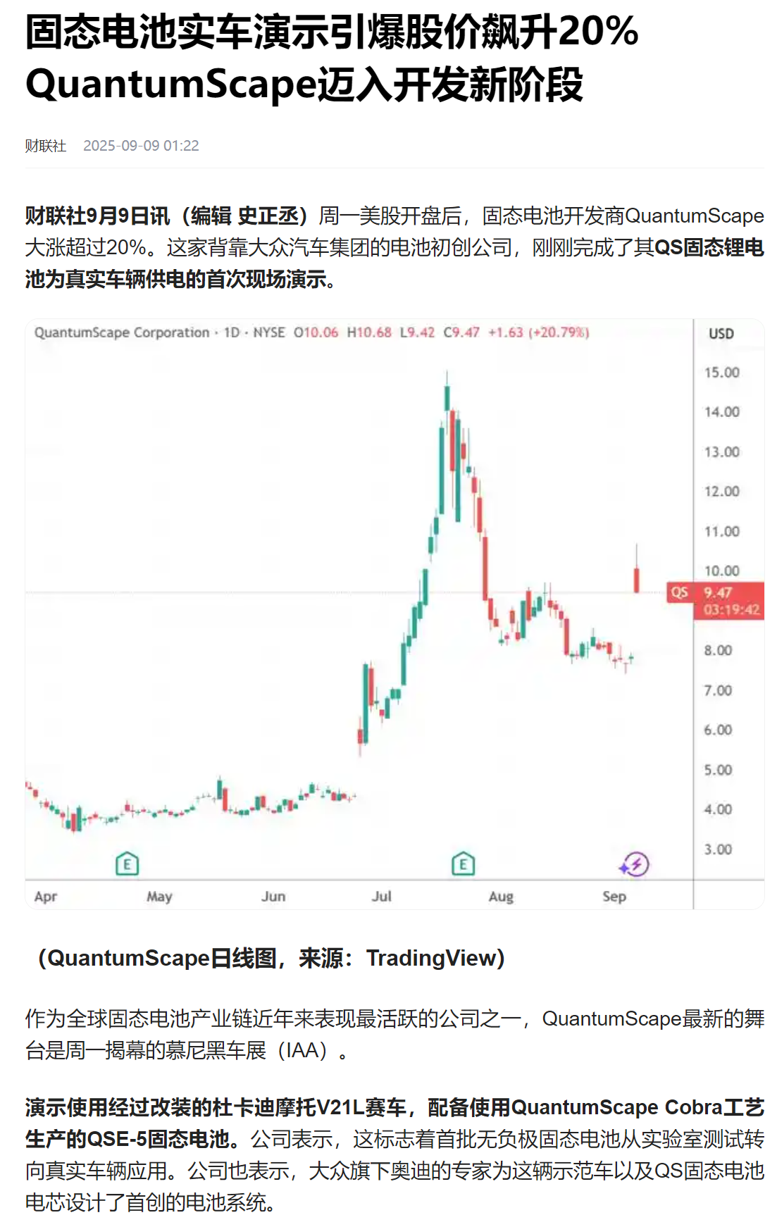 周一美股开盘后,固态电池开发商QuantumScape大涨超过20%。这家背靠大众汽车集团的电池初创公司,刚刚完成了其QS固态锂电池为真实车辆供电的首次现场演示。