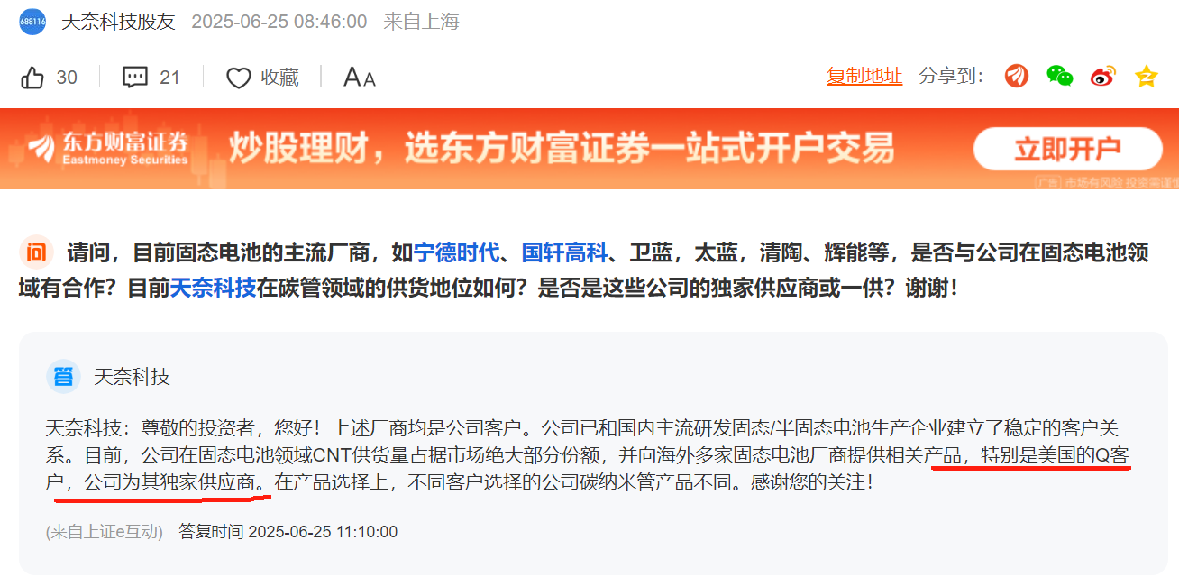 QS固态锂电池用了天奈科技的单壁,天奈科技董秘有回复 独家供应