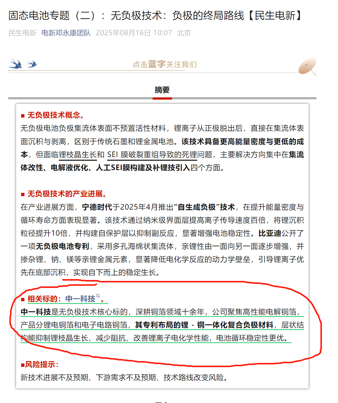 $中一科技(SZ301150)$ 【中一科技】重视!无负极技术核心标的,已送样头部客户