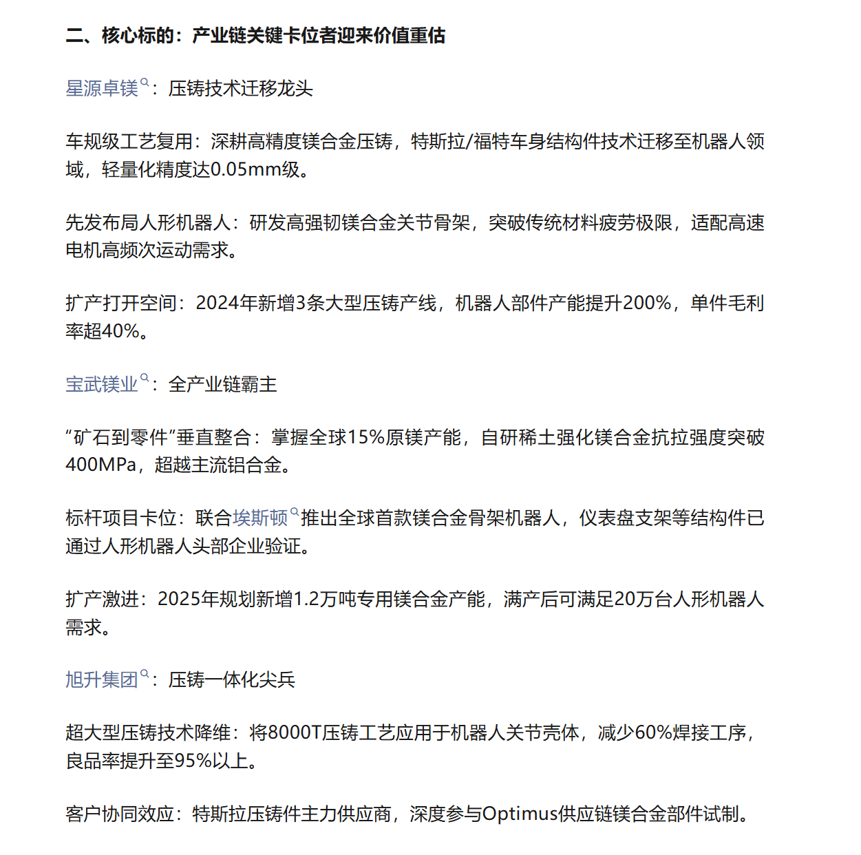 客户协同效应:特斯拉压铸件主力供应商,深度参与Optimus供应链镁合金部件试制。