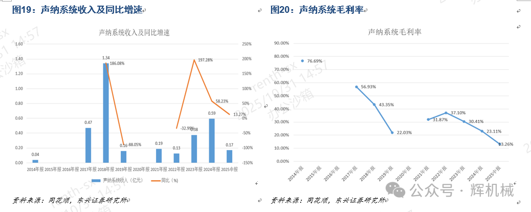 公司2024年完成某型前视避碰声呐系统首批交付及某型声呐湿端采集系统多批次交付,2025年将推进相关产品批量生产、试验及交付。随着两型产品进入批量生产,声呐系统订单量有望稳步增长。此外,公司开展鱼探仪、多波束测深仪样机研发,数字水听器、自容式水听器等产品正根据用户需求迭代升级。公司声呐系统业务近年呈现增长态势,但受行业特性影响,收入增速和毛利率波动较大。2025年上半年,声呐系统收入0.17亿元,同比增长13.27%,增速相对平稳。未来随着人工智能、大数据等技术的发展,声呐装备向着无人化、智能化方向发展,为公司产品的功能扩展和性能提升提供了广阔的发展空间。