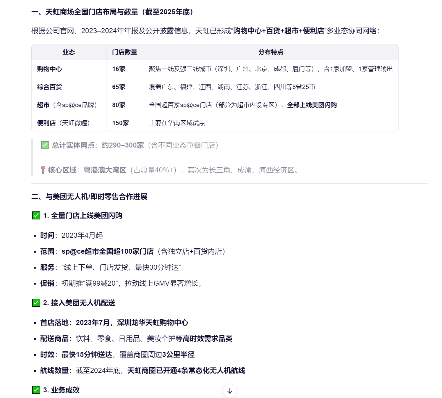 根据公司官网、2023–2024年年报及公开披露信息,天虹已形成“购物中心+百货+超市+便利店”多业态协同网络: