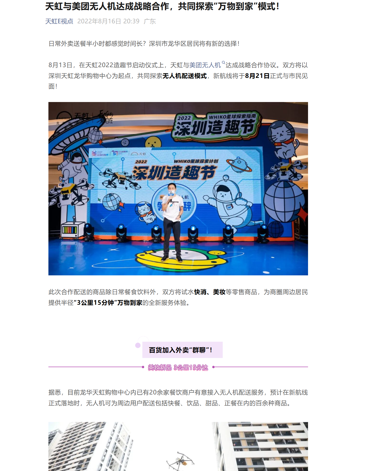 2022年:双方在深圳龙华天虹购物中心落地全国首条商超零售业态无人机配送航线,标志“万物到家”模式开启;