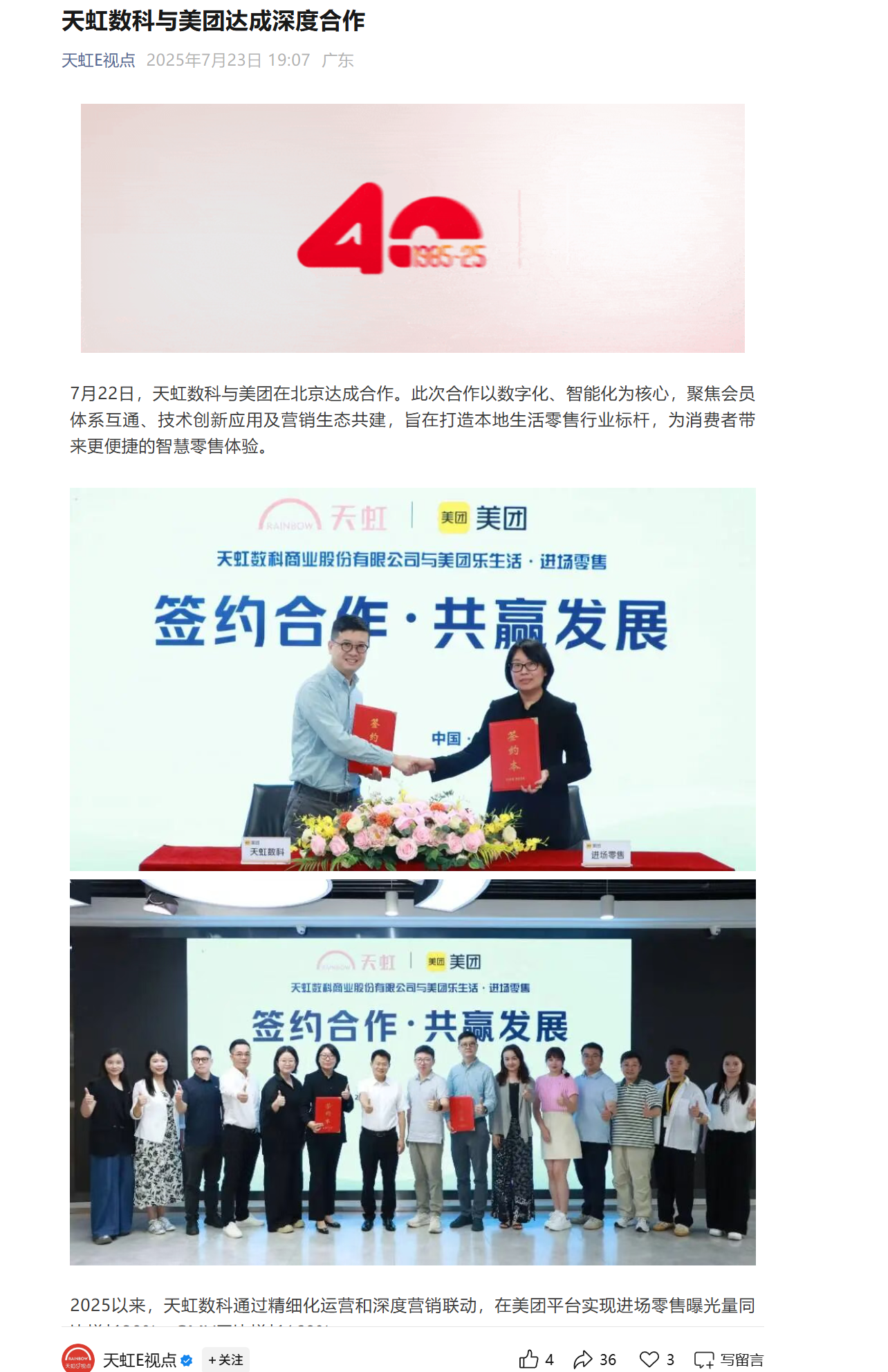 美团2024年Q3财报投资者电话会提及“与天虹深化合作”;