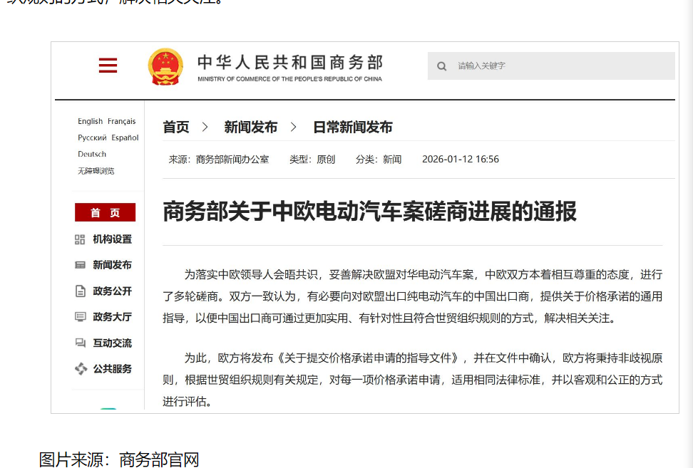 1月12日,据商务部官网消息,为落实中欧领导人会晤共识,妥善解决欧盟对华电动汽车案,中欧双方本着相互尊重的态度,进行了多轮磋商。双方一致认为,有必要向对欧盟出口纯电动汽车的中国出口商,提供关于价格承诺的通用指导,以便中国出口商可通过更加实用、有针对性且符合世贸组织规则的方式,解决相关关注。