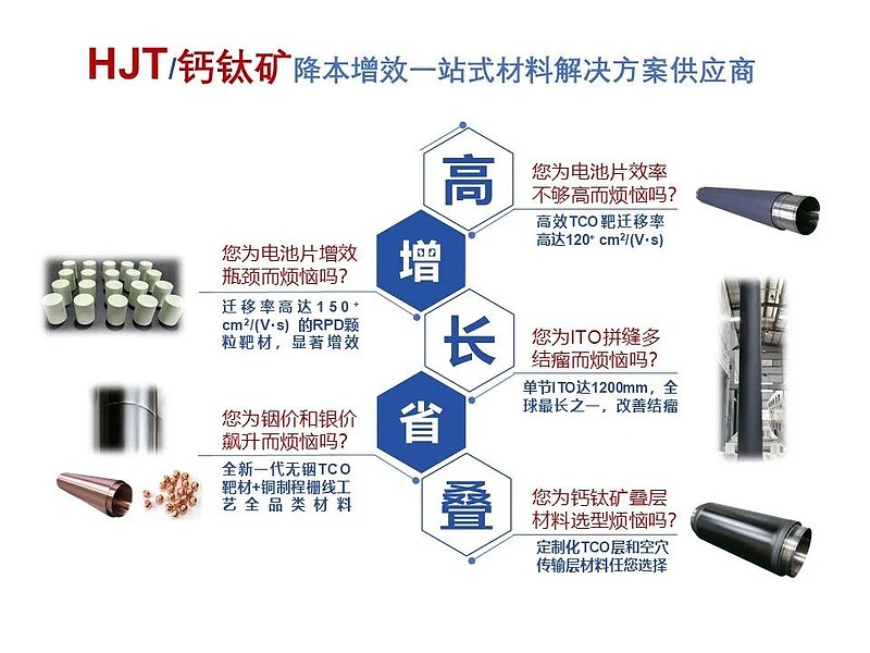 欧莱新材携高效靶材(99:1)、无铟靶材、ITO靶材、IZO靶材、RPD/PED靶材、铜制程栅线靶材及铜电镀高纯微晶磷铜球等创新产品亮相,为HJT/钙钛矿太阳能电池提供降本增效一站式材料解决方案。