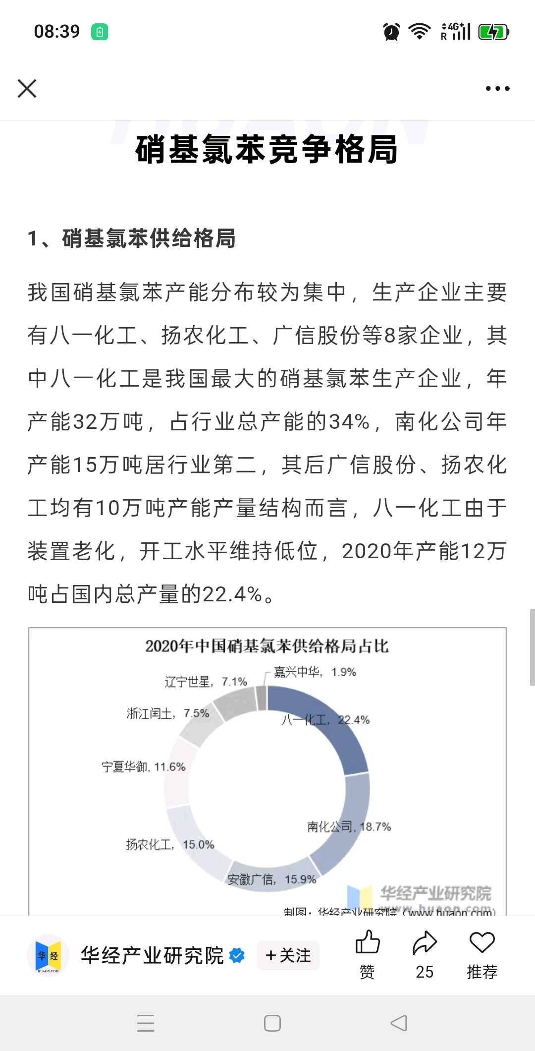 硝基氯苯供给格局我国硝基氯苯产能分布较为集中,生产企业主要有八一化工、扬农化工、广信股份等8家企业,其中八一化工是我国最大的硝基氯苯生产企业,年产能32万吨,占行业总产能的34%,南化公司年产能15万吨居行业第二,其后广信股份、扬农化工均有10万吨产能产量结构而言,八一化工由于装置老化,开工水平维持低位,2020年产能12万吨占国内总产量的22.4%。资料来源:公开资料,华经产业研究院整理