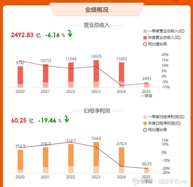 营收轨迹:2022年1.15万亿→2023年1.26万亿(峰值)→2024年1.16万亿→2025Q1 2492.8亿(同比-6.16%)