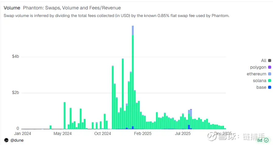 2025年对Phantom来说是冰火两重天:一边是用户和产品层面的快速突破,一边是交易量份额被交易所系钱包大幅蚕食。