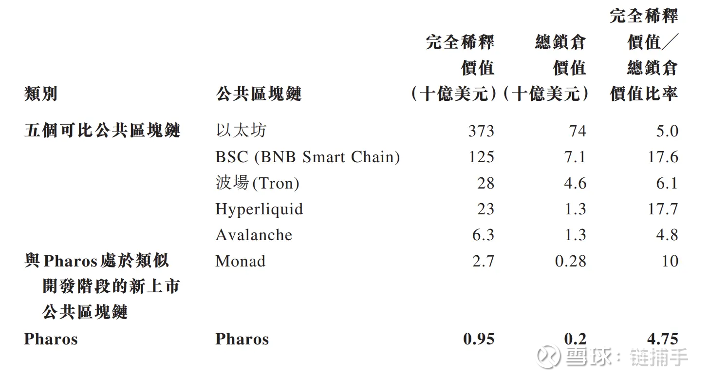 另一个有意思的信息是,协鑫新能源在协议中也详细披露了为何向 Pharos 估值定位 9.5 亿美元。根据该协议,这笔投资的估值主要基于链上总锁仓市值计算,在 Layer1 赛道,以太坊、BSC、Hyperliquid、Tron、Avalanche 的完全稀释市值/总锁仓资产价值市值比率的平均数为 10 倍,中位数为 6 倍,技术路线类似的 Monad 的比率为 10 倍。