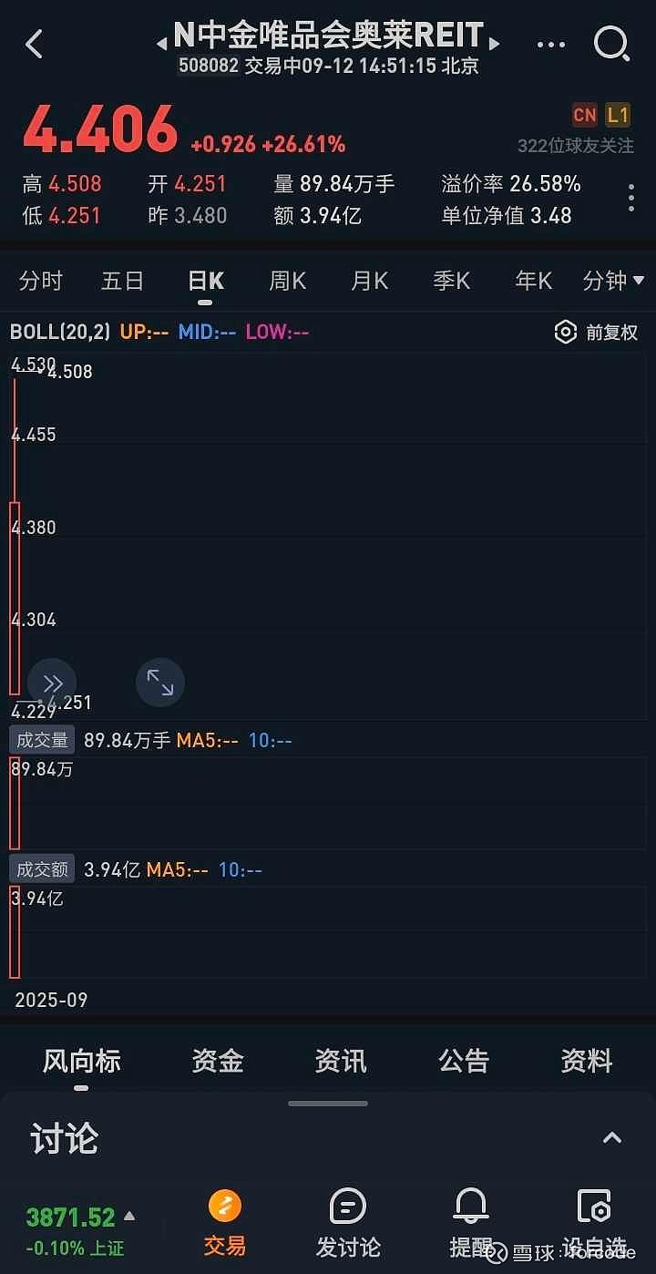 $N中金唯品会奥莱REIT(SH508082)$ 加入自选股一两个月了,今天刚上市开始交易?一个reits居然涨这么多,可见唯品会的线下奥莱资产,未来逐步装进reits,变成轻资产扩张模式,还是很可行的,唯品会线下资产的roe,未来还有持续提升潜力。