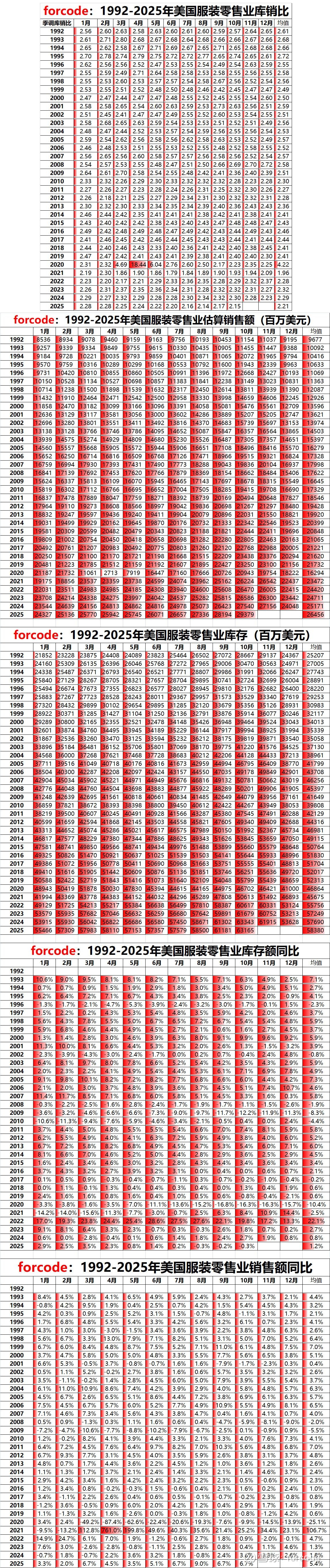 这也让我有点疑惑。但是看美国服装零售的销售额同比和库存同比,到2025年10月为止,销售额同比增长还不错,库存同比也还在下降,库销比也降低了……