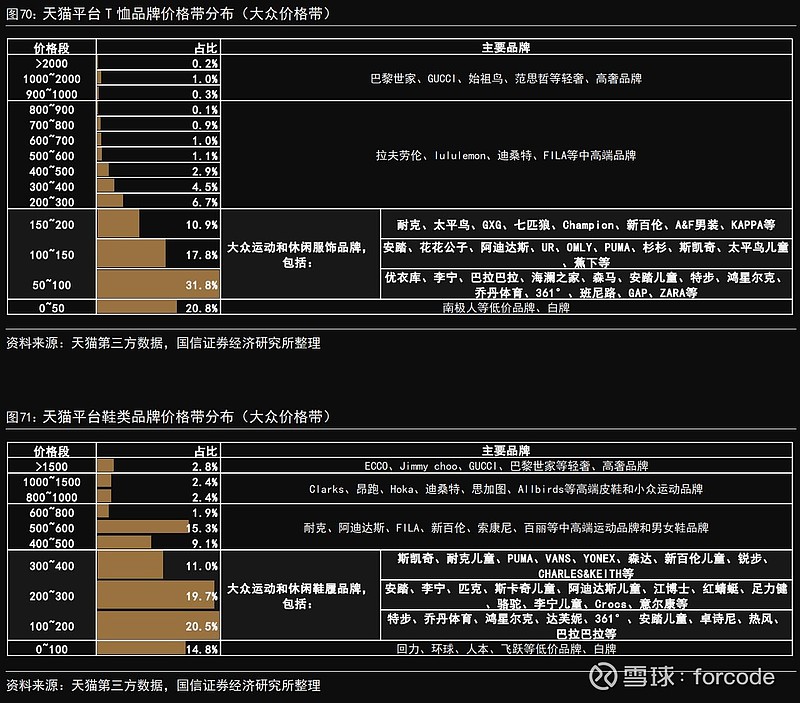 天猫平台 T 恤和鞋类品牌价格带分布(大众价格带)